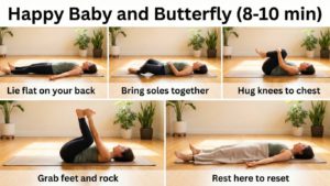 - Happy Baby (2 min): Reset your spinal alignment and calm the mind completely.