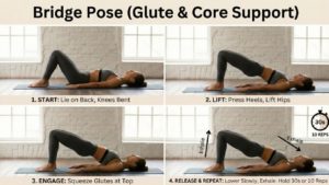 This move targets the glutes to provide essential support for the spine. A strong posterior chain helps stabilize your lower back muscles securely. It also opens up tight hip flexors caused by daily sitting. Practicing beginner yoga for lower back stability reduces strain over time. You create essential strength for your lumbar area through safe engagement.
