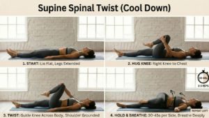 This twist neutralizes the spine safely after performing active backbends. It encourages gentle spinal rotation to release deep tension in the hips. The motion relaxes the outer hips without forcing the lumbar spine. Incorporating easy back exercises at home helps you relax. Your nervous system switches to rest mode through this passive movement.